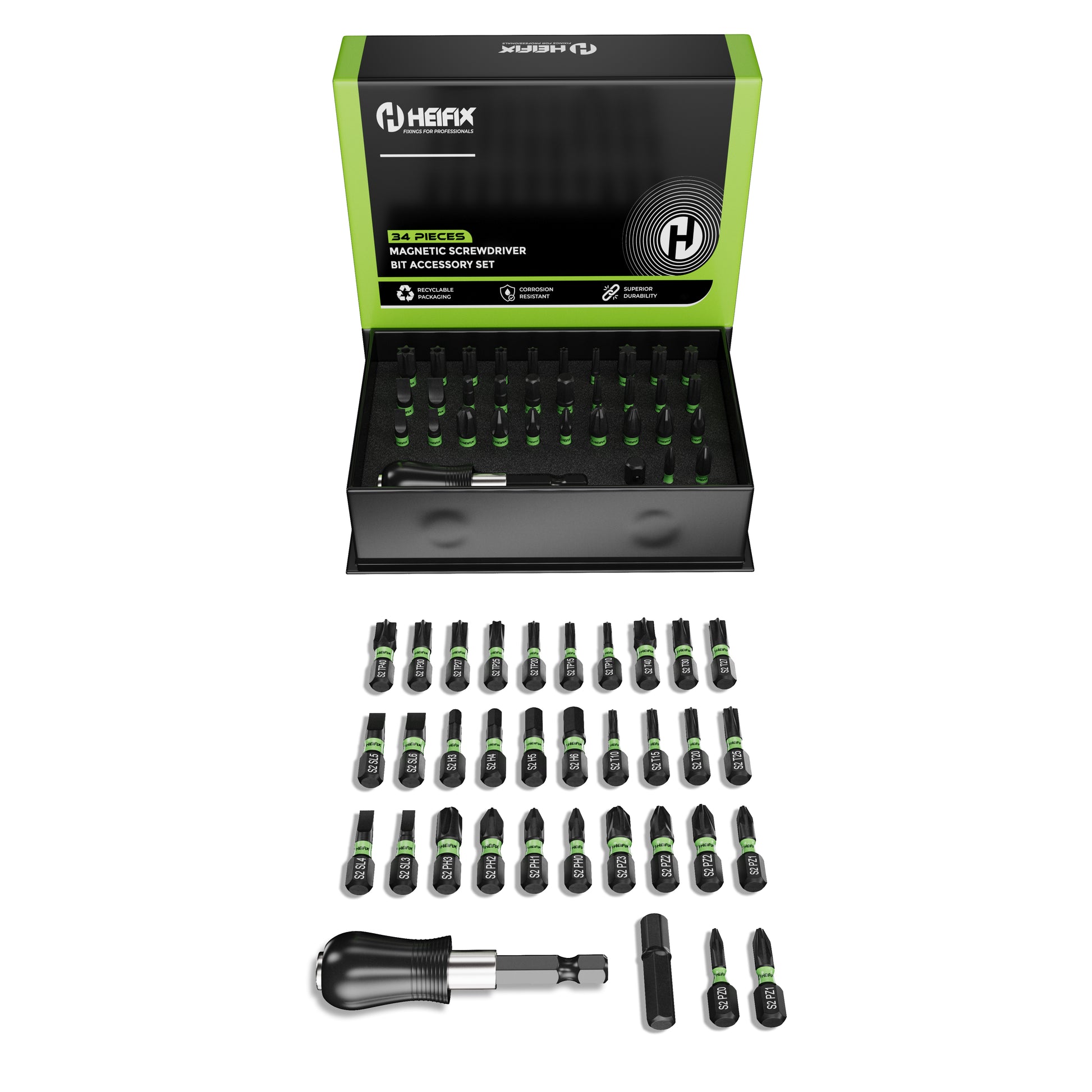 Heifix 34pcs Professional Magnetic Screwdriver Bit Set in Eco Storage Box - Quick Release Bit Holder and Adapter, with Slotted, Phillips, Pozidriv, Torx, Tamper-Proof Torx, and Hex Bits